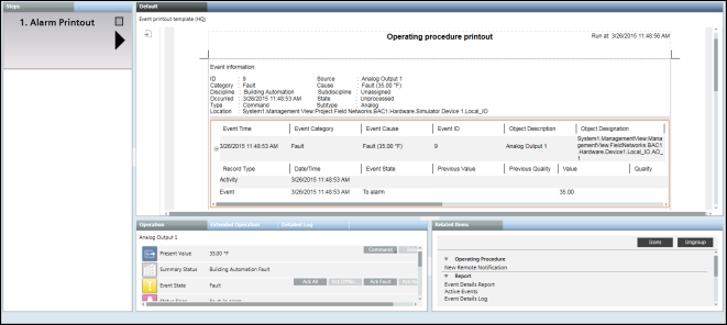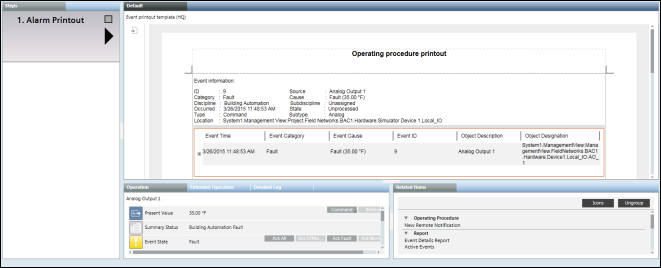 - An Alarm step is added to the operating procedure template and an Event Details report is associated with the step.