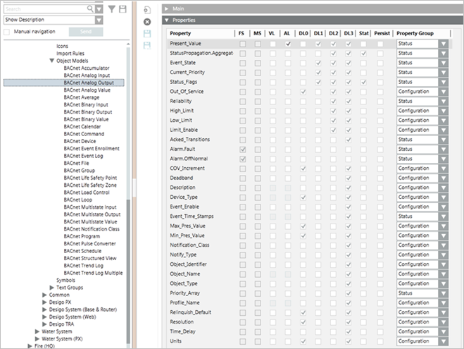 Each object has a corresponding object model associated with it. An object model specifies the properties applicable to the object type, configuration attributes of properties, and additional settings like data type of the property, text group configured for the property, commands defined for the property and so on. Each property value has configuration attributes like property name, property descriptor, unit, resolution, minimum and maximum value, and so on. For example, the Present Value property has attributes such as Unit, Resolution, Type, Descriptor and so on. The Objects report also provides information on these attributes.