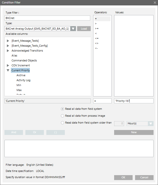 Read data from field system older than | Displays only when an Objects table is selected in the Report Definition. It allows you to specify the acceptable age of the data on which the filter is applied. If you select this option, the value entered is compared with the age of the data in the cache. If the data in the cache is older than the value entered, it is obtained from the field system; otherwise data from the cache is used for filtering. |
