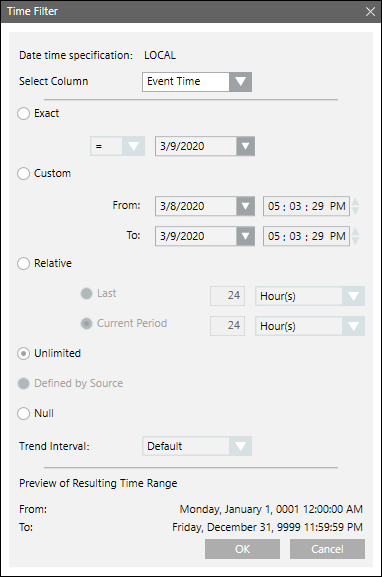 Defined By Source | This option only displays for Trend objects. It sets the date and time to what you have defined for the selected Trend View Definition. |