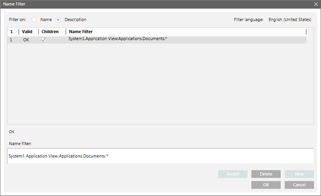 Description | Creates a Name filter according to the object description displayed in the System Browser. A message in red displays below the Name Filter list if the filter is invalid. |
