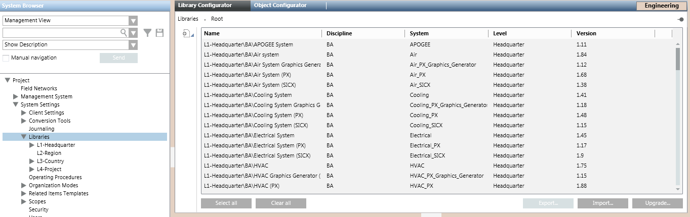 Selecting one of the library levels (L1-Headquarter, L2-Region, L3-Country, or L4-Project) causes the Library Configurator tab to display a list of all the libraries in that level.