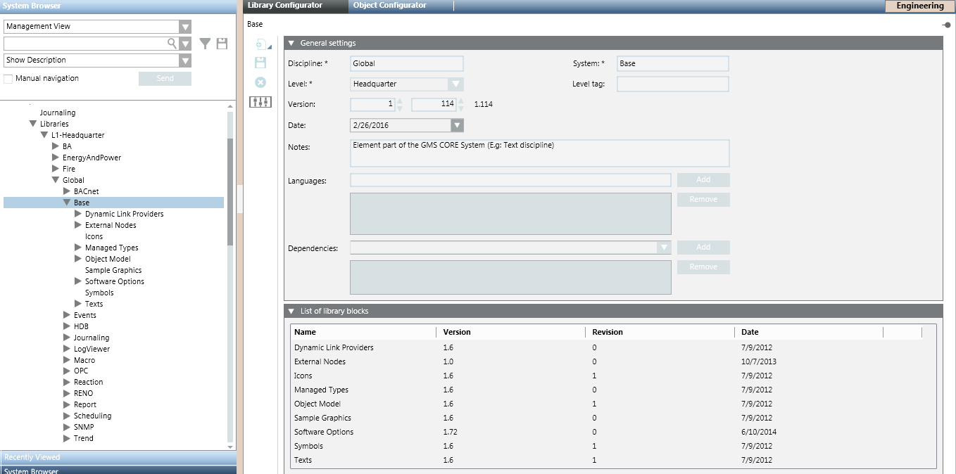 Selecting a library block (for example, Icons) causes the Library Configurator tab to display the version information of the block. From here, authorized experts can update this information if needed, or delete the block altogether.