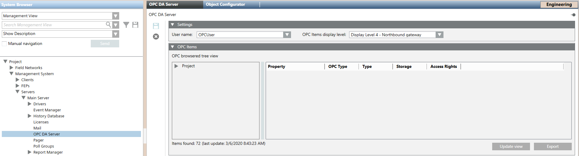 - Click Update view and refresh the OPC DA server data with the latest project data (that is, update in the OPC Items expander the display of the OPC-filtered tree view and its OPC items).