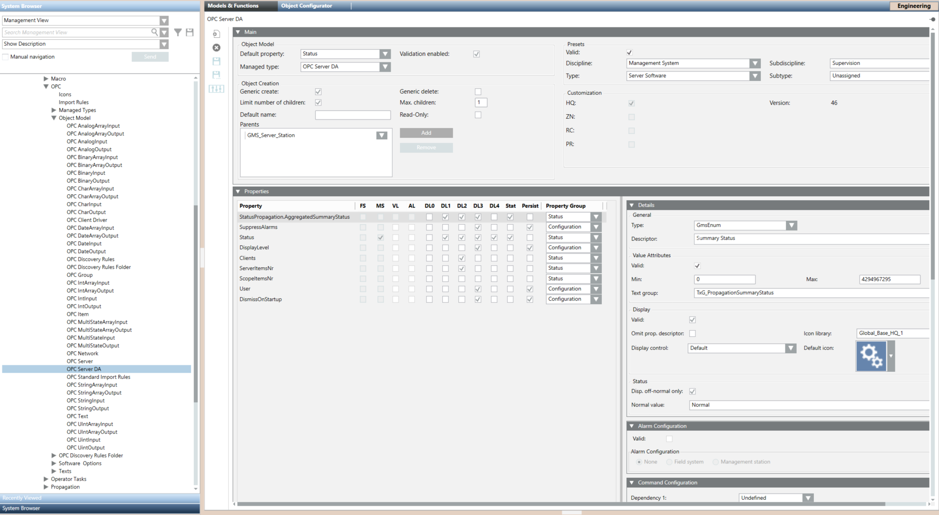The standard OPC library that supports the OPC data models is located in Management View of System Browser at the following path: Project > System Settings >Libraries > L1-Headquarter > Global > OPC.