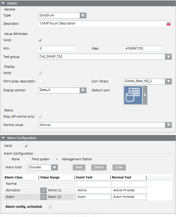- Enable the Alarm Configuration and select the Management Station option. Then define the behavior of all the alarms belonging to this DPE. For example, when the SNMP point has the value Active (read from Text Group and equal to 1), the management station will trigger an Activation event; when the SNMP point has the value Alarm (read from Text Group and equal to 2), the management station will trigger an Alarm event, and so on.