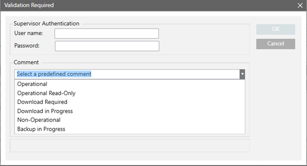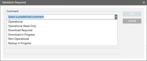 When you change or command a validated object in the management station, the Validation Required dialog box might display, depending on several factors such as the configured validation profile, the configuration of Four Eyes, and the requirement of a comment. See the following table for more detail.