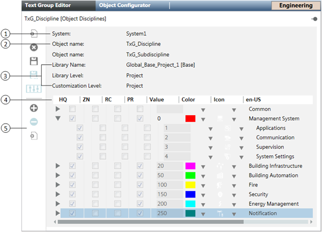 The Text Group editor also supports nested text groups so that you can view disciplines and their sub-disciplines. In the following example of a text list, the Building Automation discipline is selected and expanded to show the three subdisciplines related to it.