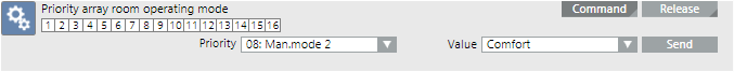 NOTE: In principle, any priority between 1-15 can be selected. Other BACnet operator units also use priority 8 though. So that any BACnet operator unit can reset the override to priority 8.