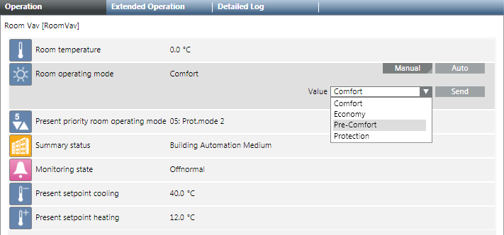 - In the Operation tab, select the Room operating mode property.