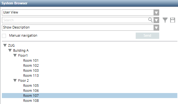 - In the System Browser or floor plan view, select the room to operate.