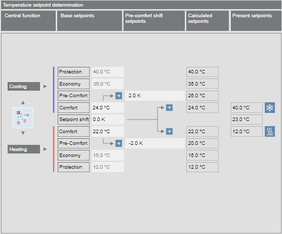 The present room setpoints are calculated using various indicators. The setpoints used to control the room depend on the room operating mode and the set room adjustment.