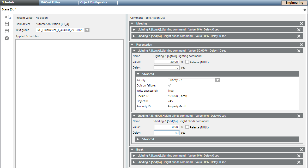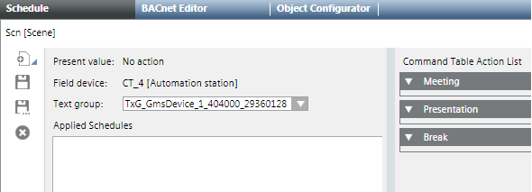 - Drag additional objects, for example, FanSpd (fan speed), Lgt (Light) or Shd (blinds) to the [Meeting] expander.