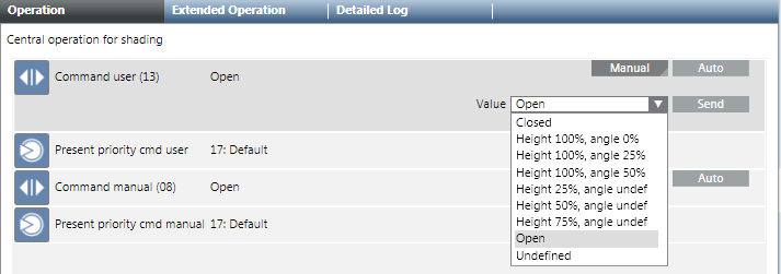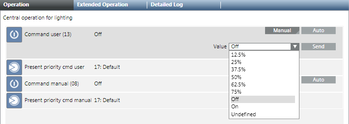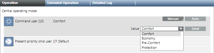 1. Select Applications > Logics > Central Functions > [Network name], property User command (13) [Category] > [Central Operating Mode (CenOpMod)].
