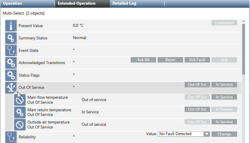 • The objects must be of the same type, such as analog input. If different object types are selected, the message No properties (different properties) displays in the Operation tab.