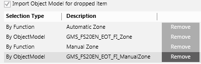 NOTE: If you add any object models to the filter, make sure to include all required object models along with all functions. Removing functions or objects models may result in unexpected or incomplete results. Consider for example the selection illustrated in the image below. It includes both functions and object models for automatic zones and manual zones. Removing the Manual Zone object model from the last position would exclude manual zones even if the Manual Zone function remains. Instead, removing both object models would result in including both types of objects because no object model filtering occurs.