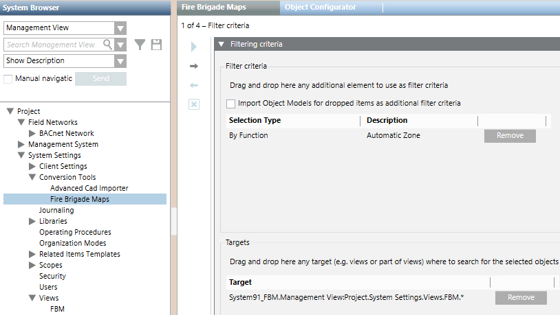- System Browser Target. Narrows down the set of objects to only consider those in selected parts of the installation, for example one or more buildings or floors.