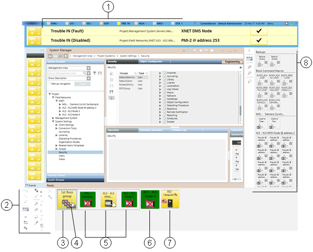 The Node Map is fully integrated with the other system applications. You can select one or more nodes in the Node Map, and then operate on System Manager, Event List, and Macro Viewer on the selected set to see status information and start control actions. The commands to connect/disconnect and to take and transfer the ownership of fire control panels are directly available in the Node Map toolbar.