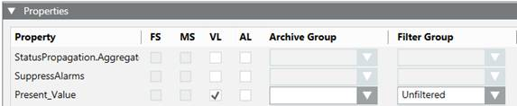 • Filtered: When data points are assigned to value based filtering type filter group, data is logged based on Percentage and Absolute deadband values and if assigned to time interval logging type filter group, data is logged based on the interval defined. See Filter Groups Workspace.