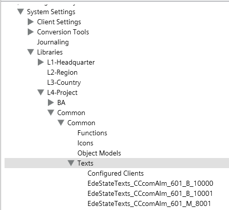 One text group is created for each state text during an EDE file import. The text groups are saved in the Management View in System Browser under Project > System settings > Libraries > L4 project > Common > Common > Texts. The descriptive name of the text group is formed from EdeStateTexts+File name+Number. A file name with a space is supplemented with _ (underscore).