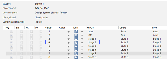 - Define the maximum stage of the fan *TxG*,TxG_BA_3147,4 for a 2-stage fan. This value is used if no value is defined in the max-present-value column.
