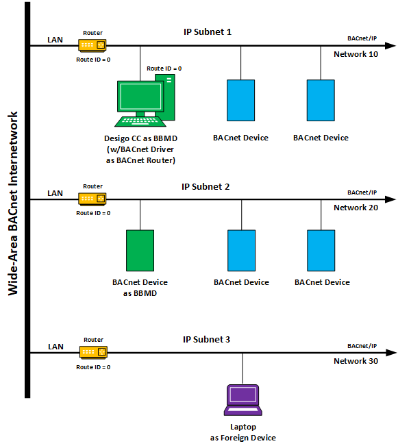 - IP Subnet 3 consists of a laptop functioning as a Foreign Device (FD). The laptop can communicate directly with any other device on the network, but it must register with a BBMD to receive broadcasts from devices on other IP subnets. If the laptop in this configuration registers with the BBMD on IP Subnets 1 and 2, the FD will be able to receive broadcasts from all the devices on those subnets.