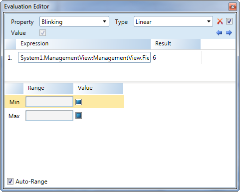 Display the minimum and maximum range applied to the expression value. If the expression value falls below the Min value, then the associated Value is applied to the property evaluated. If the expression value is higher than the Max range, than that Value is applied to the property.