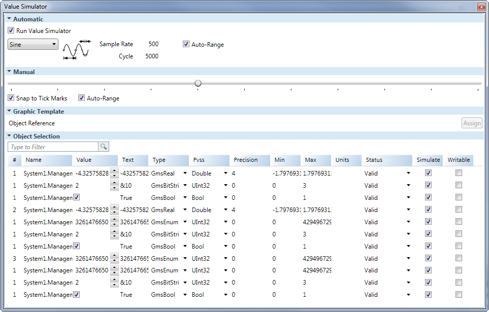 Object List Section All data points available for simulation are listed with the following information: | |