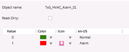 • TxG_HVAC_Alarm_01.1 = This references the Normal state (see above) which is represented by the Color green.