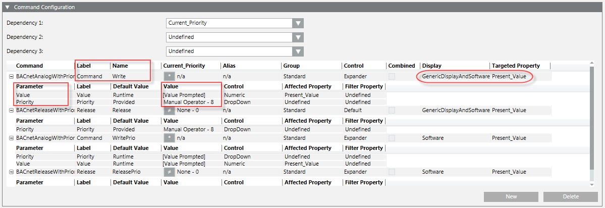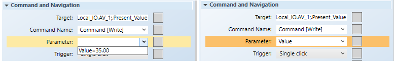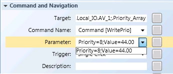 • Command with multiple command parameters across different command controls. For example, a Numeric control for the Value; a Numeric control for the Priority, and a Send button to command your Priority Array property. A user edits the value of all the parameters individually and then sends the command with all the values using a Send button.