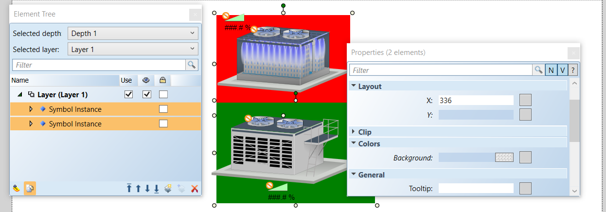 In the example below, two symbol instances are selected for bulk editing. However, each has a different Background color and Y position. Therefore, the fields display a blue color. Both elements share the same X position and therefore the value is the same and displayed for both: