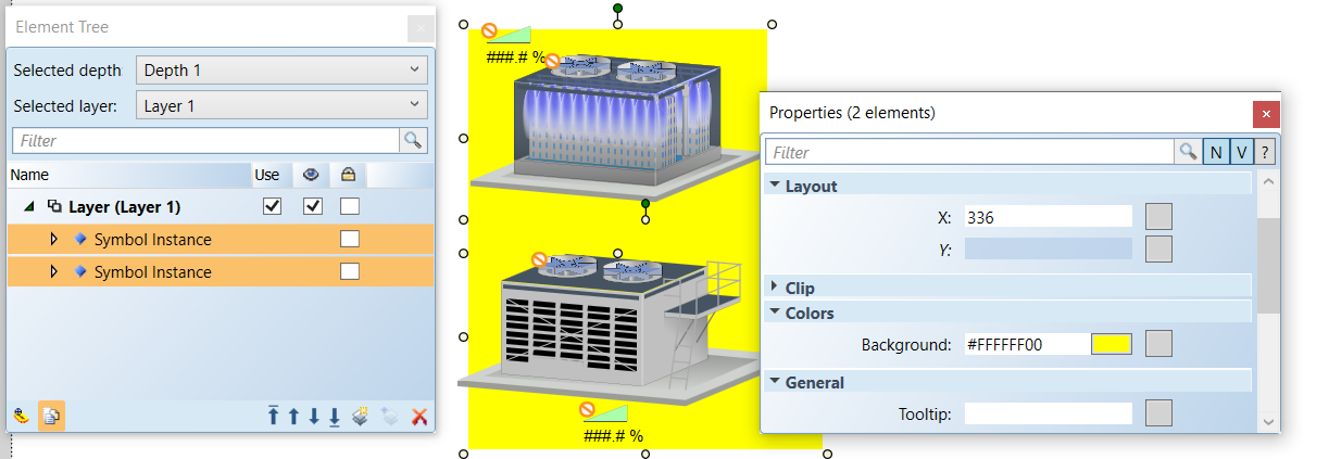 With the multiple elements selected and then changing the Background color to yellow, the field is updated and the color yellow is applied to both Symbols: