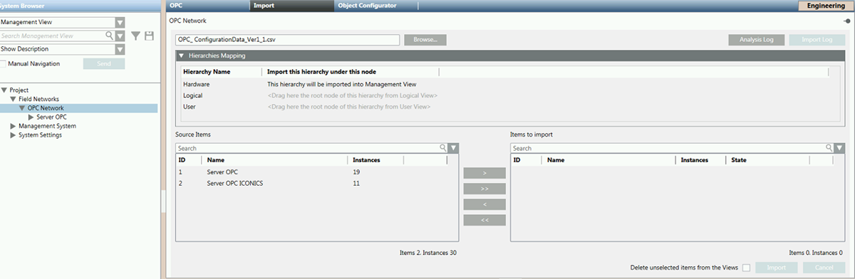 When you are in Engineering mode and select the OPC network in System Browser, the Import tab lets you define the hierarchies mapping and then import the OPC servers described in a CSV configuration file. For instructions see Importing Third-party OPC Server Data.