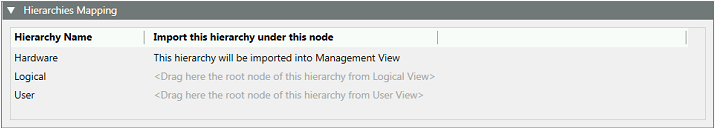 Before you import OPC items from a configuration file, the Hierarchies Mapping expander lets you define in which System Browser view hierarchies of objects will be imported, that is, where they will be automatically built according to the management, logical, or user-defined level. By default, the Hardware hierarchy is assigned to the Management View only. For the logical view or user-defined view, you must assign the view root level.