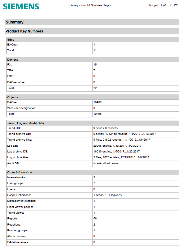Migration package: A package with graphics, trend views, trend data, log data, and subsystem data is generated together with the system report (PDF) in a zip file. You can set the data to be included in this package for a specific project.