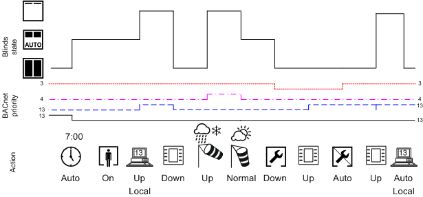 A shading group can only be switched on and off if the present priority is higher than the present, pending priority. Switching is only possible once the normal state is restored; switching is not possible as long as the priority is lower due to a safety function.