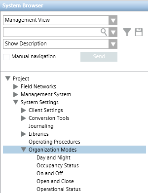 When you select an organization mode object in System Browser (for example, On and Off), you can view the current value of an organization mode in the Operation or Extended Operation tab, and also manually set its value from there.