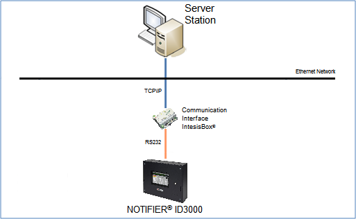 The ID3000 fire control panel can communicate with the management station over the Modbus TCP protocol via the IntesisBox communication interface, which works as a bridge between the Modbus over TCP\IP and the RS232 protocol used by the fire panel.