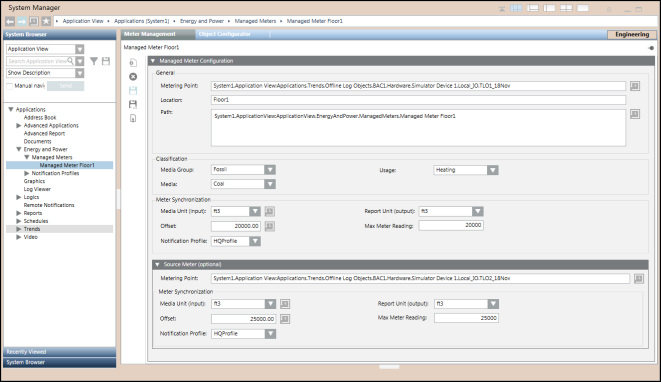 The Meter Management configuration workspace facilitates creation and configuration of managed meters. You can access this screen by selecting Applications > Energy and Power > Managed Meters. The Meter Management tab is accessible only if you select the Managed Meter application directly from the Security application.