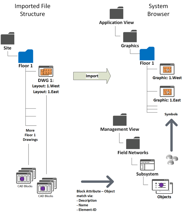 - The tool creates one Desigo CC graphic per selected layout and include the symbols for the identified CAD objects. See an application example in Advanced CAD Import Example for FS20.