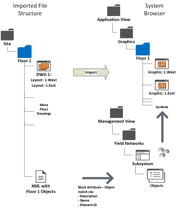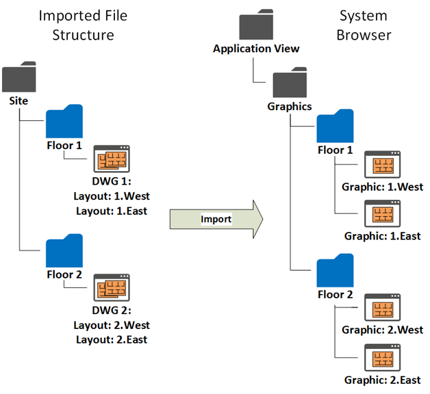 The import procedure replicates the subfolder structure under the Desigo CC Graphics folder of the Application View, and creates new Desigo CC graphics that contain the drawings as background.