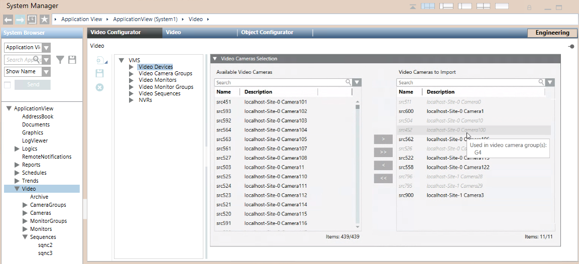 - The VMS > Video Devices tree lists all the cameras of the connected VMS, including ones that are disabled. By default, all the enabled cameras will propagate to Applications > Video > Cameras > in System Browser, while any disabled ones are excluded.