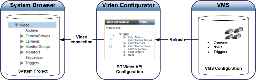 - Configuration changes made in the VMS (cameras, triggers, and NVRs) propagate to Video Configurator upon execution of a Refresh command. From Video Configurator, the changes propagate to System Browser when the Video System is