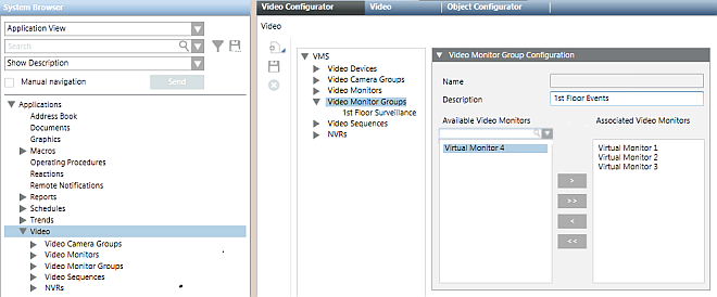 - The new monitor group is added to the Video Monitor Groups folder of the VMS tree and under Applications > Video > Monitor Groups in System Browser.