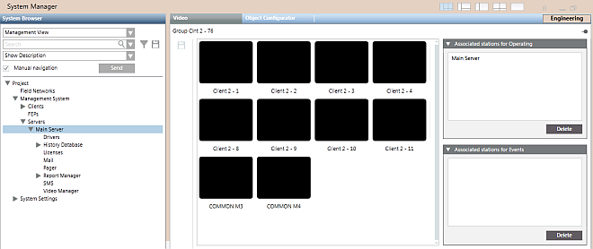 To be able to display video, a management station must have an assigned monitor group for operation, that will populate its video view. In addition, to be able to display video during alarm handling, a station must also have an assigned monitor group for events. The Desigo CC server station has two preconfigured monitor groups assigned to it by default. Any other stations need to be manually assigned a monitor group before they can display video.