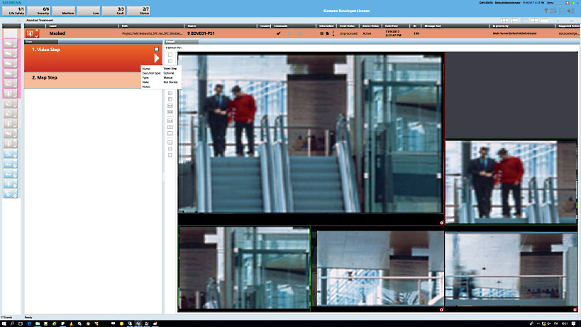 - If the procedure includes a Video Step, when you select that step the video view will display a grid of live or automatically-recorded video images relevant to the event, or to the object in alarm.