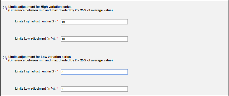 | Enter a numeric value (between 0 to 25) for Limits High Adjustment (in %) and Limits Low Adjustment (in %) |