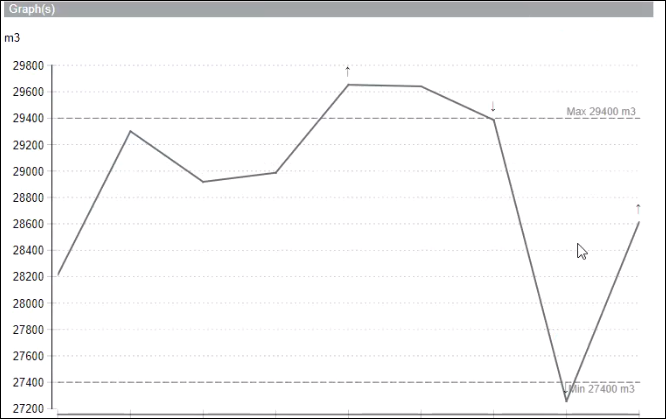 Consumption values that are above the maximum limit line are represented by a red arrow and values below the minimum limit line are represented by a blue arrow in the report table.