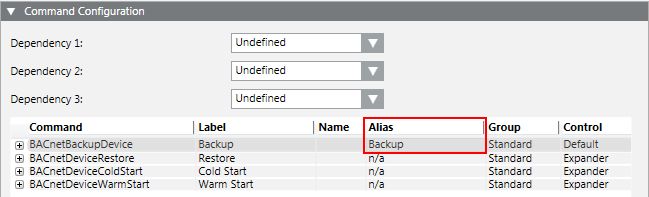 - In the Command Configuration expander, check the BACnetBackupDevice entry. Enter the Backup name in the Alias column. If not entered, select the alias name from the drop-down list.
