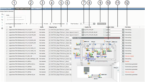 The graphics generator generates room mapping graphics in lieu of the existing room templates. The pages are generated based on existing rooms and room segments that are available on the Desigo automation station and set up on standard applications. For RC-specific applications, the corresponding room mapping graphics and associated functions must be available prior to generation.